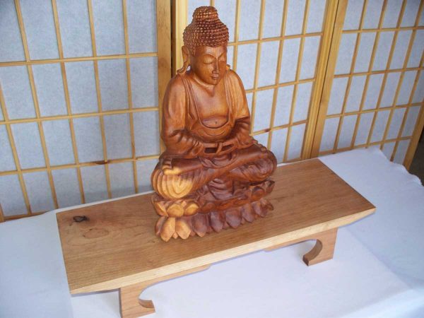 Altar tables from Daily Zen Woodcraft are hand-finished with a clear base Cabot premium wood finish. This allows the unique colors and patterns of the wood to be expressed. The natural luster is easily maintained with any fine furniture oil. All woods are carefully selected from sustainable species. Our artisans prefer not to waste materials, so no two tables are exactly alike. The “Mountain Style” altars offer a larger center piece for your meditation space.